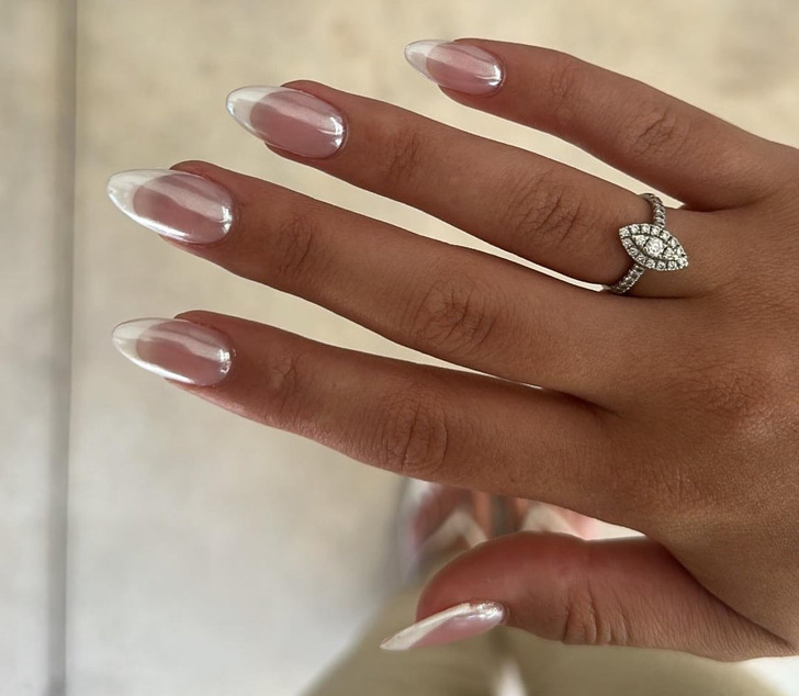 Jeśli chcesz, aby twój manicure wyglądał nowocześnie, luksusowo i niebanalnie, ale jednocześnie zachował wyrafinowanie, to francuski manicure z chromowaną powłoką będzie doskonałym wyborem. Taki design ozdobi każdą wieczorową stylizację. Eksperci zalecają stosowanie stonowanej bazy, na przykład nude, mlecznej lub przezroczystej. Ponieważ głównym akcentem będzie blask. Do tego celu używa się specjalnej wcierki lub żelu z perłowym efektem. W ten interesujący sposób można dostosować trend do siebie.