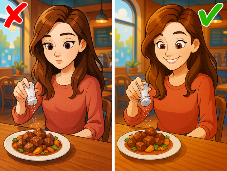 Dodatkowe przyprawy, a także sól i parmezan powinny być dodawane dopiero po tym, jak spróbujesz dania. W nieformalnych okolicznościach nie krępuj się dodawać wszystko, co chciałbyś, ale w oficjalnej sytuacji może to zostać uznane za obraźliwe, nawet jeśli tylko posolisz danie. Jeśli jesteś w drogiej restauracji i nie widzisz na stole pieprzu i soli, może to mieć swoje powody. Najprawdopodobniej kucharz poświęcił dużo czasu na stworzenie dania i jest pewien, że jego smak jest całkowicie zbalansowany i nie wymaga dodatkowych przypraw. Nie jest przyjęte, by posypywać solą całe danie, należy ją nasypać na krawędź talerza.