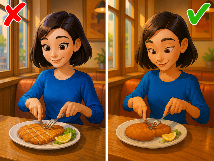 Należy odciąć część jedzenia w taki sposób, aby od razu włożyć cały kawałek do ust. Oczywiście, jeśli chodzi o pomoc dziecku, to pokrojenie dania na początku posiłku jest akceptowalne. Nawiasem mówiąc, nie dopuszczaj do tego, aby na łyżce lub widelcu pozostała zawartość po tym, jak włożyłeś ją do ust.