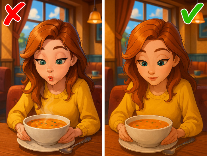 Bez względu na to, jak gorące jest podane danie, w żadnym przypadku nie dmuchaj na nie. Poczekaj kilka minut i dopiero wtedy zacznij posiłek. Podczas nieformalnych spotkań można poprosić o kostkę lodu, aby ochłodzić gorący napój.