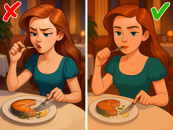 Jeśli podczas przeżuwania pokarmu natkniesz się na kość lub chrząstkę, porządnie przeżuj tyle mięsa lub ryby, ile masz w ustach, a dopiero potem przystąp do usunięcia niejadalnego elementu. Zasada jest taka: jeśli jedzenie było spożywane widelcem to kość także powinna zostać usunięta za jego pomocą, a jeśli jadłeś rękami, to kość powinna być usunięta ręką.