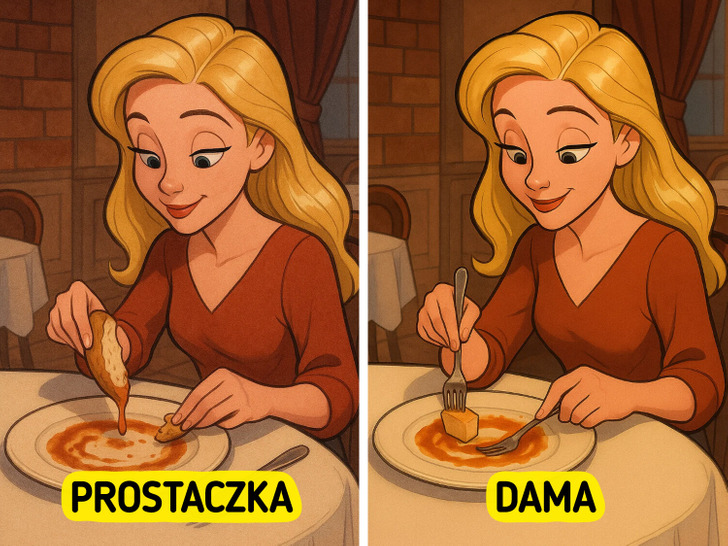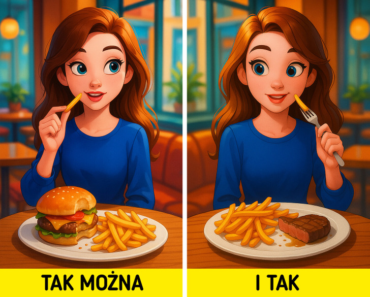 Jeśli na nieformalnym obiedzie podano ci burgera z frytkami, to, tak samo jak burgera, można je jeść rękami. Ale jeśli frytki podano w parze ze stekiem, to, podobnie jak stek, należy nakłuwać je widelcem. Czyli frytki należy jeść w taki sam sposób, jak danie główne, z którym są podane w zestawie.