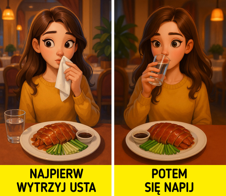 Podczas posiłku warto często używać serwetki, aby uniknąć niezręcznych sytuacji. Ust nie należy wycierać serwetką, a raczej przyciskać ją lub delikatnie opukiwać nią usta. Należy to zrobić obowiązkowo również przed piciem, aby brzegi szklanki pozostały czyste. Nawiasem mówiąc, nawet jeśli odczuwasz silne pragnienie, zgodnie z zasadami etykiety ważne jest, aby pić małymi łykami. Pij dopiero po całkowitym przeżuciu jedzenia.
