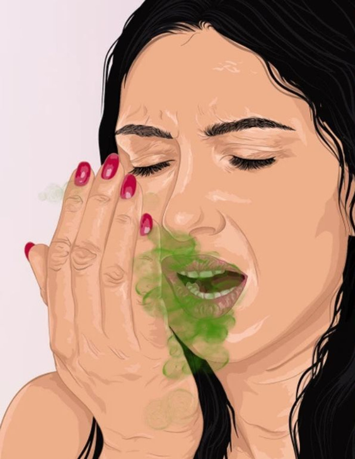 - Spowolnione trawienie, zaparcia i choroby jelit mogą powodować nieświeży oddech. Refluks żołądkowo-przełykowy, występujący przy chorobie refluksowej przełyku (GERD), powoduje cofanie się kwasów żołądkowych i wypychanie woni treści pokarmowej do przełyku i ust, co powoduje nieprzyjemny oddech lub halitozę.