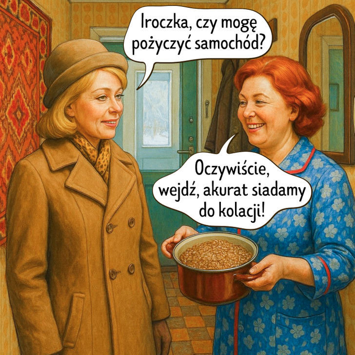 Jeśli w domu zbierała się cała gromada gości, to często brakowało miejsc do siedzenia dla wszystkich. To jednak nie oznaczało, że trzeba było natychmiast biec do najbliższego sklepu meblowego i dokupować potrzebne taborety i krzesła. Po pierwsze, taki sklep nie zawsze znajdował się tuż za rogiem, a i asortyment tam nie zawsze cieszył oko. Po drugie, zapasowe taborety często nie miały gdzie być przechowywane. W takich sytuacjach pomocą służyli sąsiedzi. U nich zawsze można było pożyczyć dodatkowe meble, a czasem i naczynia, jeśli oczywiście sami nic nie świętowali.