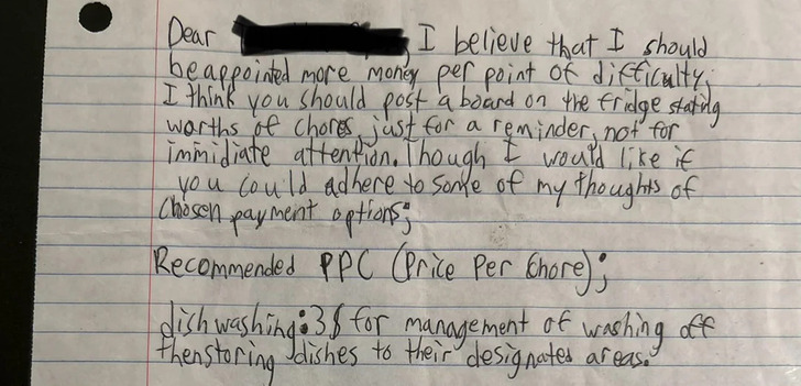 „Uważam, że powinienem otrzymywać więcej pieniędzy za każdy poziom trudności. Należy wywiesić na lodówce tablicę z przypisaną wartością każdego z obowiązków, tak dla przypomnienia, nie żeby przykuwały uwagę. Chciałbym też, abyś spróbował zastosować się do niektórych moich pomysłów dotyczących wynagrodzenia za poszczególne rzeczy.