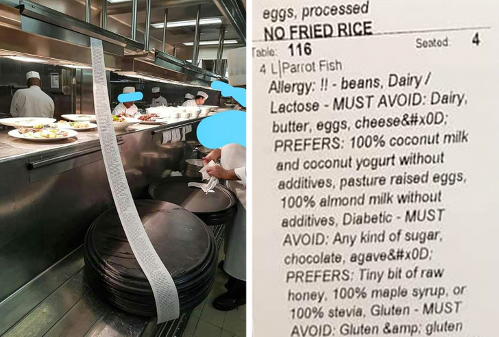 7. „To wydruk zamówienia dla 4 osób. Reszta to «preferencje» i alergie pokarmowe. Wow”.