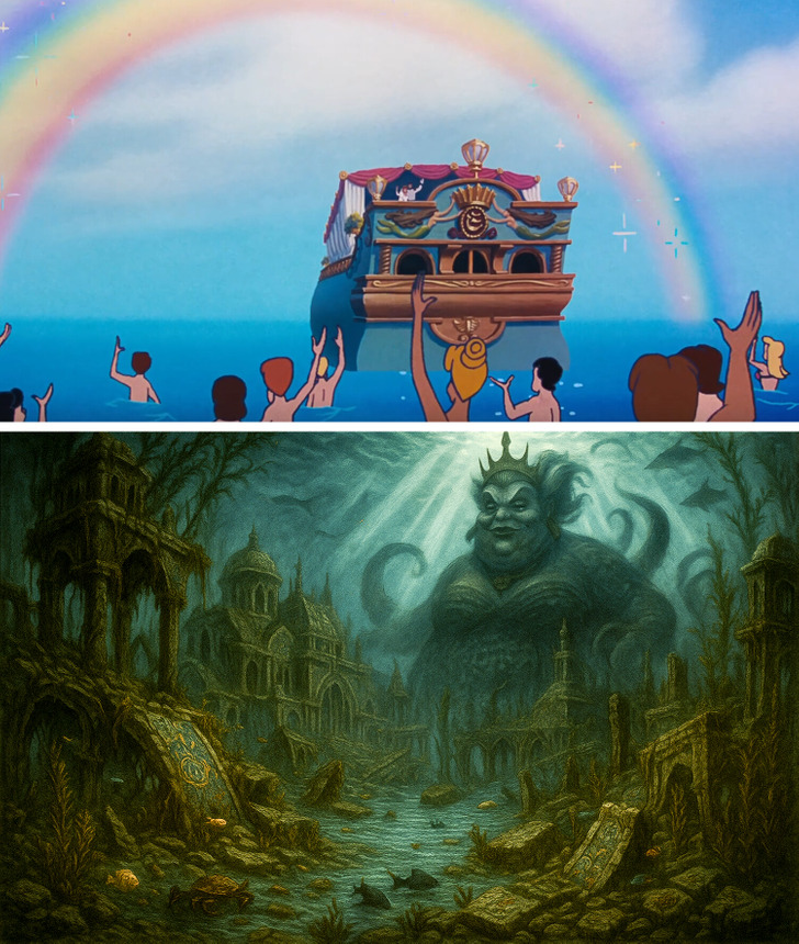 Po zwycięstwie Ursuli Atlantyka zamieniła się w ponure ruiny, gdzie ciemność i wodorosty pochłonęły niegdyś lśniące pałace.