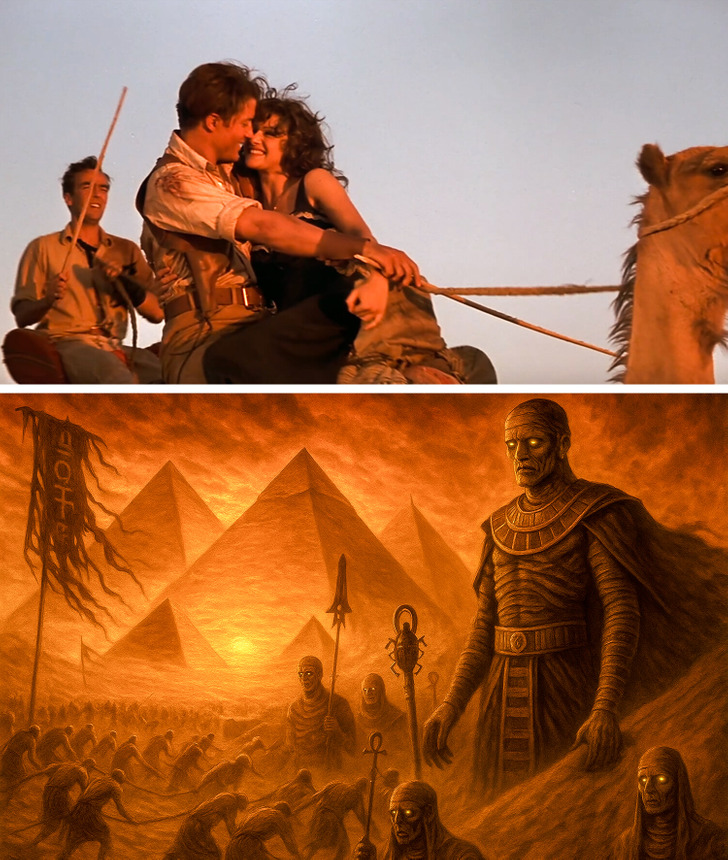 Pod szkarłatnym zachodem słońca pustynia płonie, a na horyzoncie rozciągają się majestatyczne piramidy, wzniesione na chwałę Imhotepa. Tłumy wyczerpanych ludzi wznoszą nowe monolity, a nad nimi panują ożywione mumie.