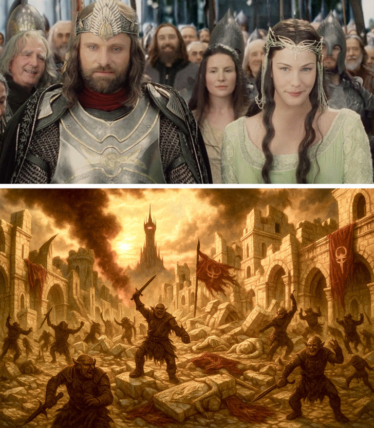 Po zwycięstwie Saurona białe mury zamku leżą w popiele, połamane jak kości giganta. Na ruinach rechoczą orkowie, a nad horyzontem kłębi się ciężki dym.