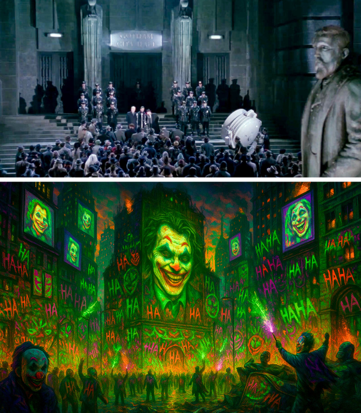 Po zwycięstwie Jokera miasto pogrążyło się w chaosie: ulice są zasypane ruinami, ściany pokryte szalonym graffiti, a latarnie migają, jakby drwiąc.