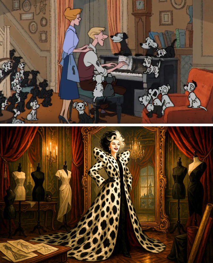 Świat Cruelli tonie w modzie i szaleństwie: na wybiegach pojawiają się modele w śmiałych czarno-białych strojach, a ulice są zasłonięte plakatami z jej twarzą.
