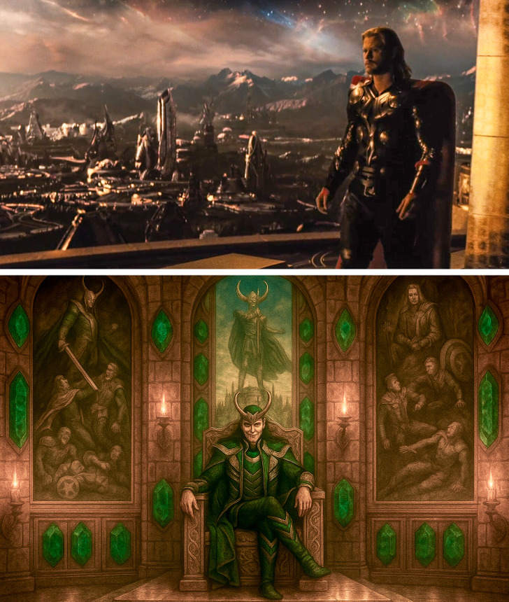 Wspaniała sala tronowa zrobiona ze złota i szmaragdów lśni na cześć Lokiego, a na ścianach wiszą obrazy, gdzie wiecznie pokonuje swoich wrogów.