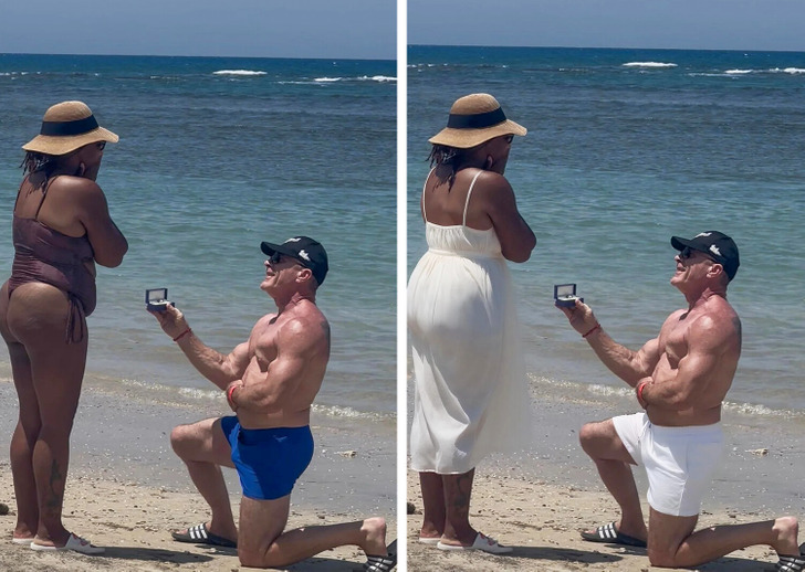 „Oświadczono mi się na plaży! Martwię się jednak o mój wygląd na tym zdjęciu — w stroju kąpielowym wszystko mam na wierzchu, a chciałabym wydrukować tę fotografię do rodzinnego albumu. Czy ktoś mógłby ją trochę poprawić?”.