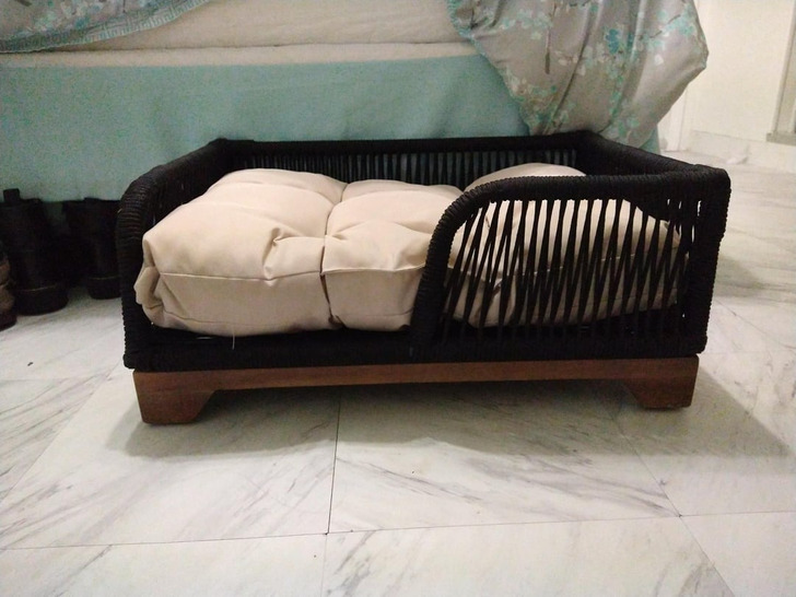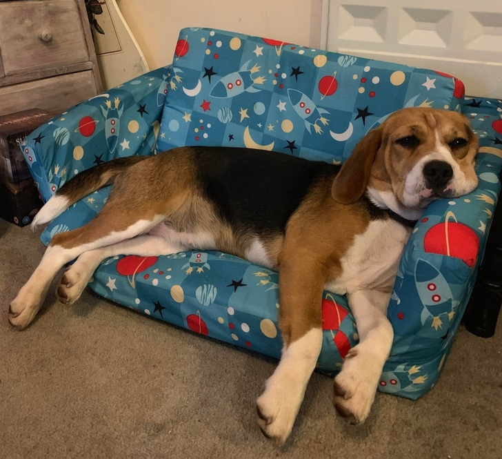 „Mój mąż pracuje na targowisku i dziś ktoś przyniósł tam dziecięcą sofę. Nasz pies czuje się na niej jak król”.