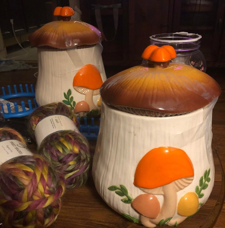 „Pracuję w second-handzie i dziś udało mi się upolować vintage słoiczki w kształcie grzybów. Cud, że nikt ich wcześniej nie zabrał!”