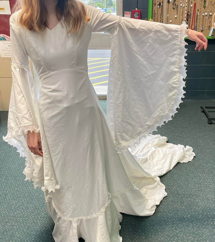 „Znalazłam fantazyjną suknię ślubną w second handzie, w którym pracuję. Po prostu zakochałam się w tych rękawach!”