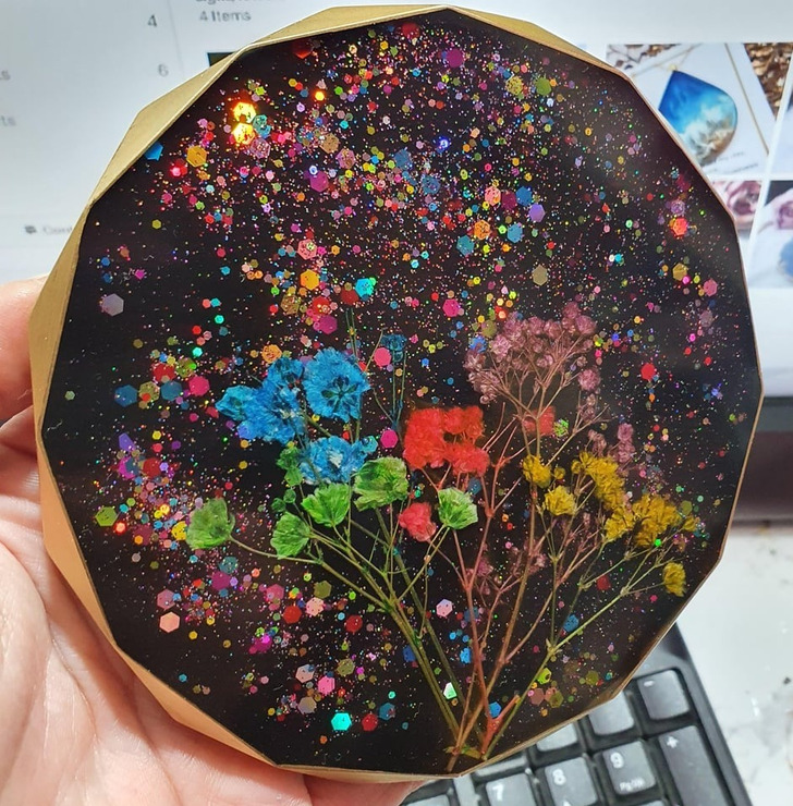 „Podstawka, którą dziś wykonałam. Nie mogę się doczekać, aż dodam ostatnią błyszczącą warstwę, by kwiaty stały się bardziej wyraziste”.