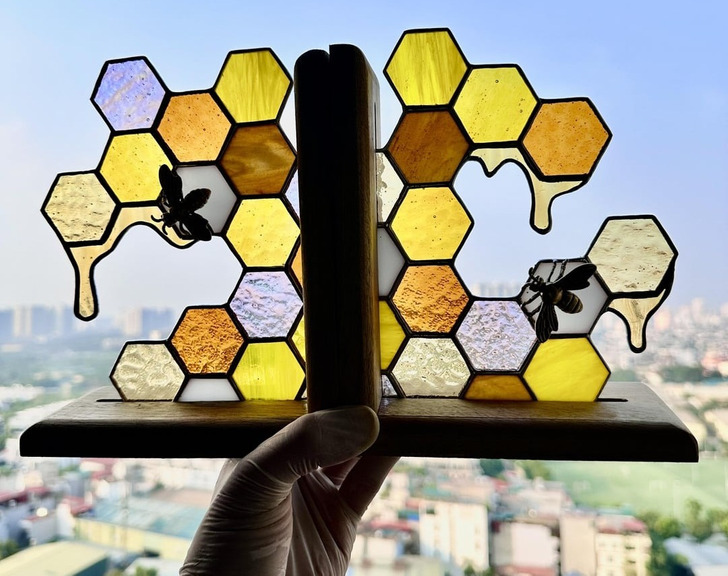 „Witrażowe podpórki do książek w kształcie uli, które niedawno ukończyłam”.