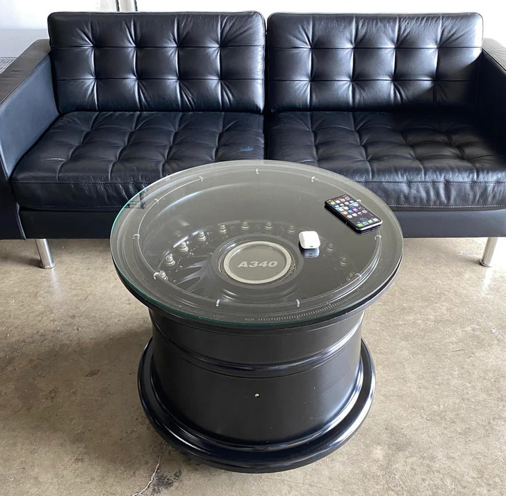 6. „Koło od samolotu pasażerskiego zostało przerobione na ważący 125 kg obrotowy stolik kawowy”.