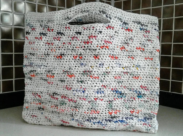 10. „Torba na zakupy zrobiona na szydełku z plastikowych toreb”