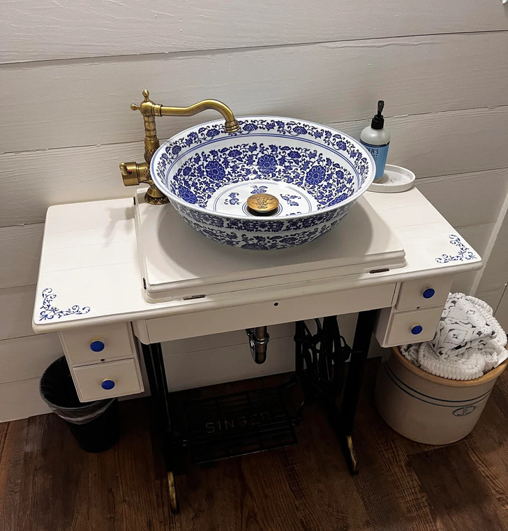 2. „Moi rodzice odbudowali rozpadający się, stuletni dom mojego dziadka z dzieciństwa. Na początku prac znaleźli równie starą maszynę do szycia Singer, schowaną w rupieciach i gruzie, i przerobili ją na umywalkę”.