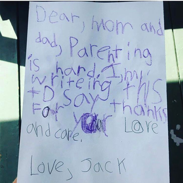 „Drodzy mamo i tato, rodzicielstwo jest trudne. Piszę to, by podziękować wam za miłość i troskę. Z wyrazami miłości, Jack”.