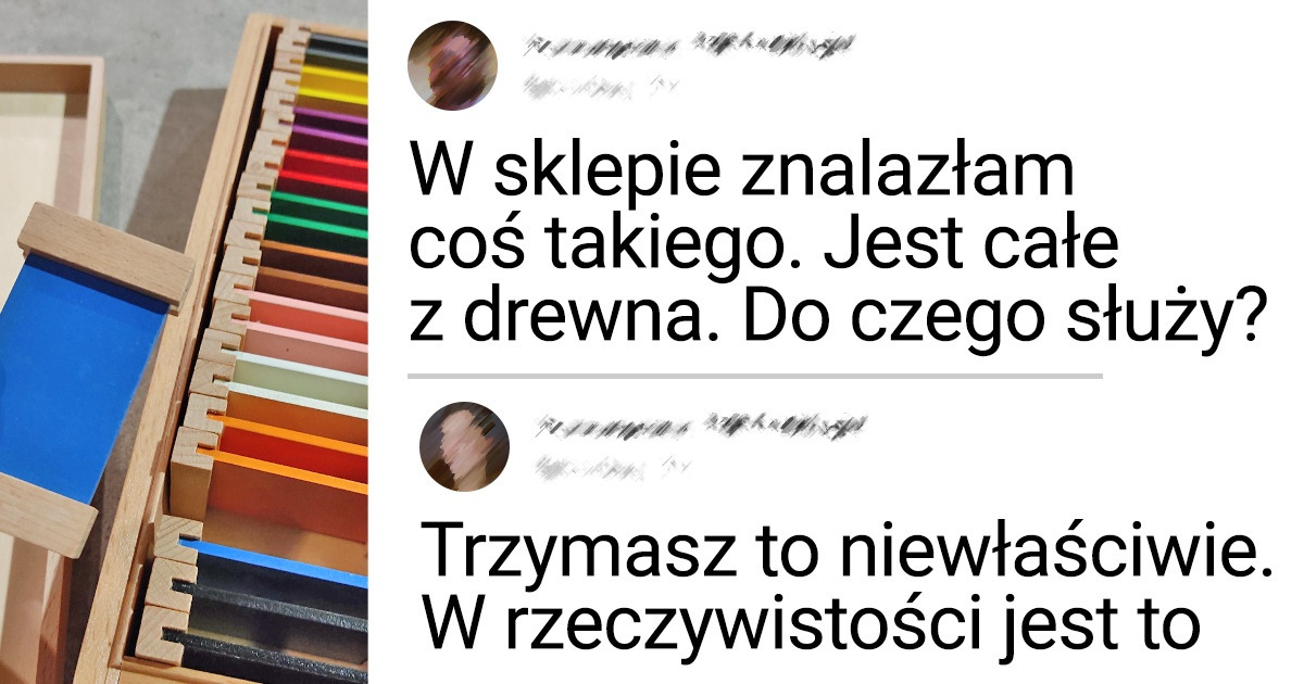 Odpowiedź: „Trzymasz je nieprawidłowo. To kolorowe tabliczki Montessori, narzędzie edukacyjne dla dzieci, które uczy dotyku, kolorów, motoryki małej, organizacji i sprzątania po sobie. Powinnaś trzymać je za drewniane krawędzie”.