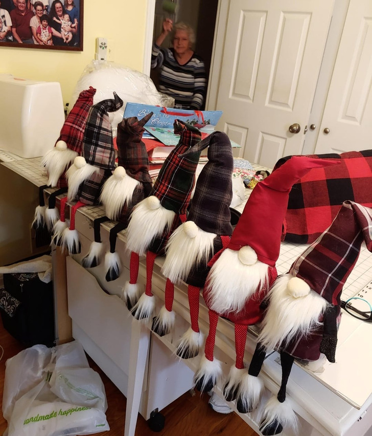 „Uszyłam te gnomy jako prezent dla krewnych męża. Są zrobione z koszul teścia, którego już nie ma. Uwielbiał Boże Narodzenie i kraciastą odzież”.