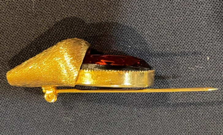 - Wygląda jak przypinka do klapy marynarki. Kamień przypomina granat, a kolor pasuje do złota. Czy są jakieś oznaczenia z tyłu przypinki? Zazwyczaj lokują tam oznaczenia, ale są tak malutkie, że mogą wyglądać bardziej jak żłobienia niż oznaczenia, w zależności od tego, jak dobre masz oczy. © Mindless-Ad-1759 / Reddit