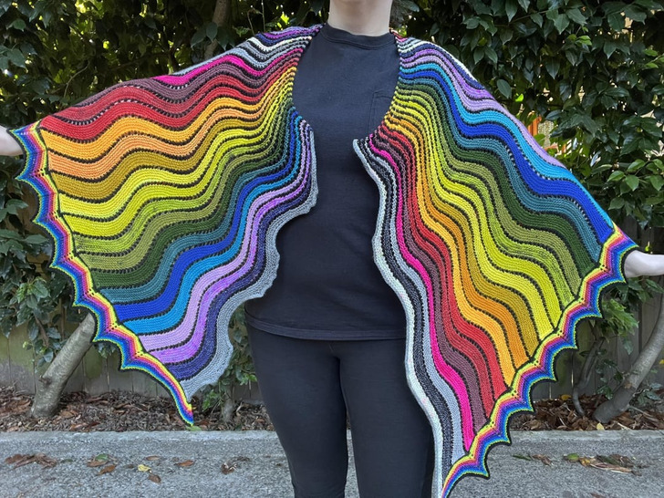 „Przez lata zebrało mi się wiele resztek włóczki, które chciałam w końcu jakoś wykorzystać. W rezultacie powstała taka wspaniała chusta”.