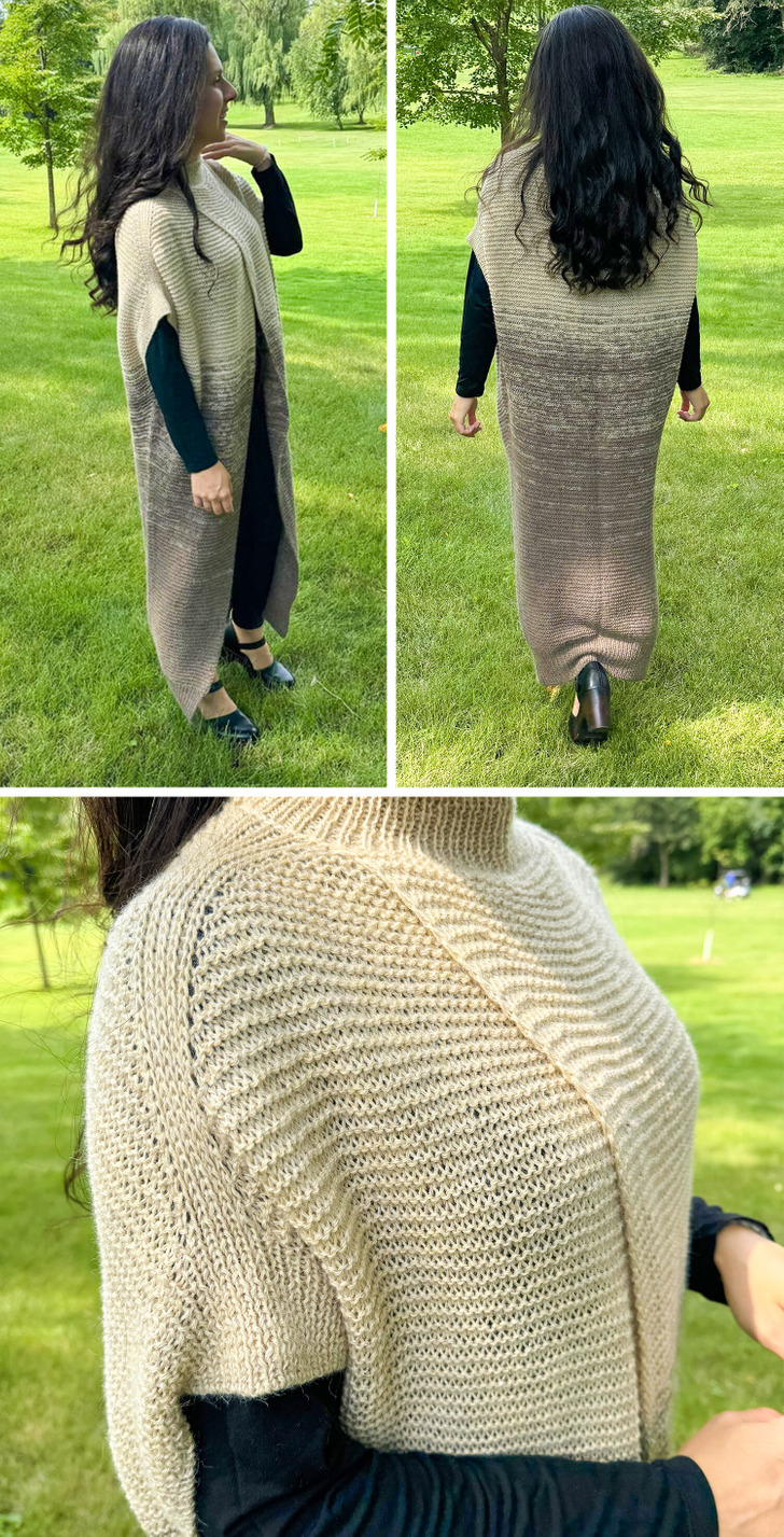 „Przypadkowo zrobiłam na drutach śpiwór nadający się do noszenia. Miała to być niewielka narzutka, ale okazała się znacznie dłuższa, niż się spodziewałam”.
