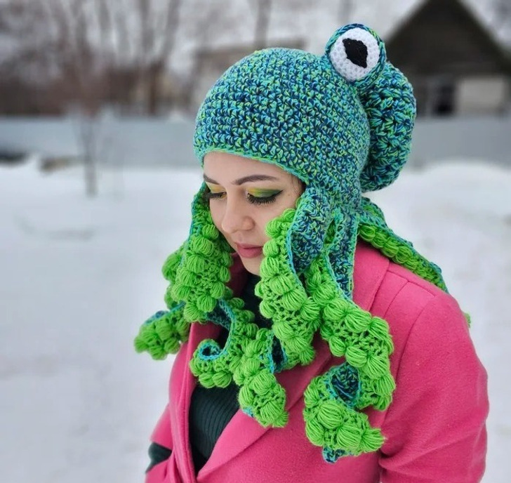 „Zrobiłam czapkę ośmiornicę. Ma podszewkę, żeby zimą głowa mi nie marzła”.