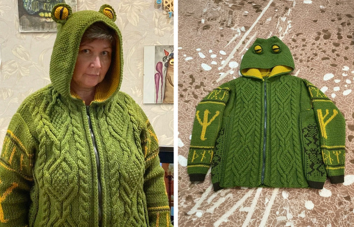 „Zrobiłam na drutach sweter z motywem żaby”.