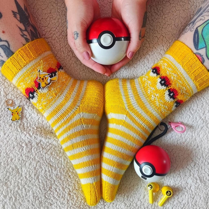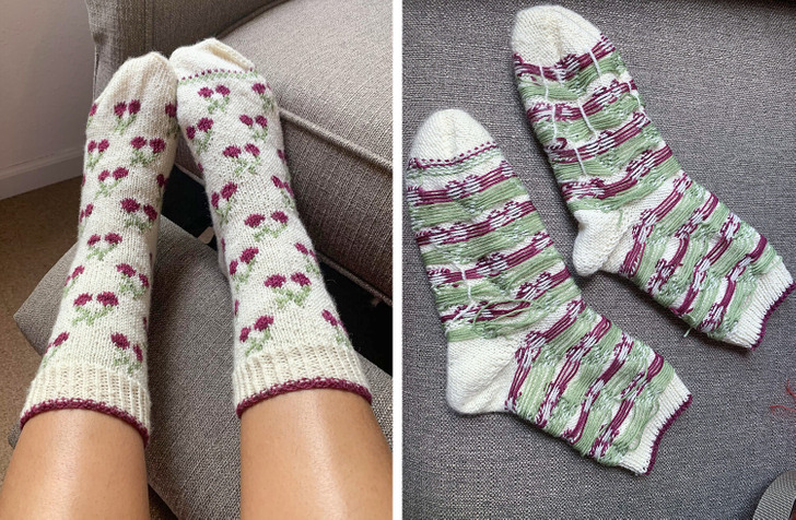 „W końcu udało się sparować brakującą skarpetkę! Zaczęłam ją jeszcze w maju, potem zrobiłam przerwę na lato, a oto i one, moje śliczne skarpetki”.
