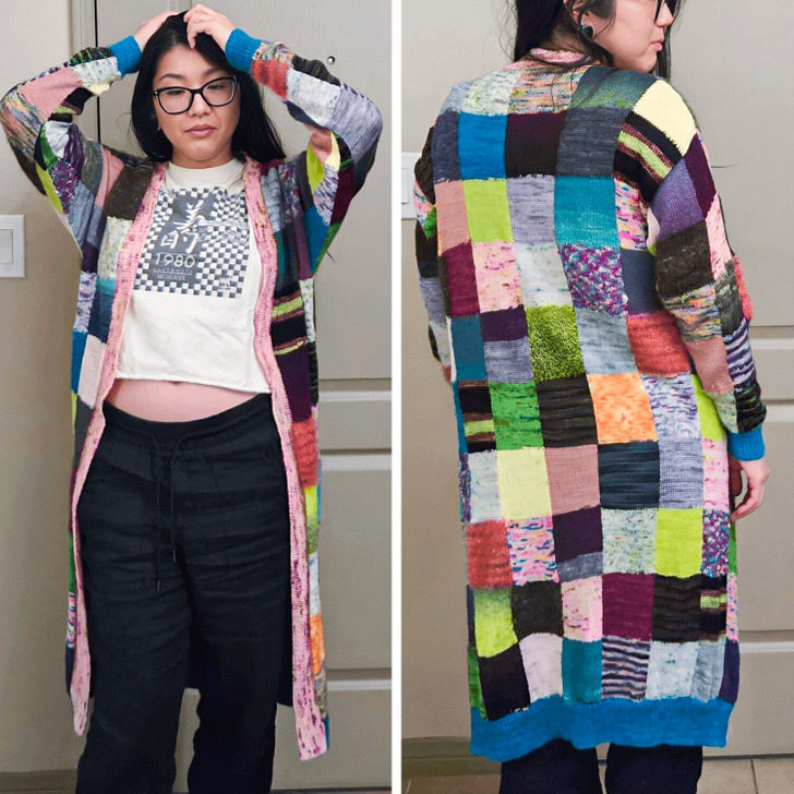 „Zrobiłam patchworkowy kardigan w trzy miesiące. Udało się wykorzystać mnóstwo resztek włóczki. Tak bardzo podoba mi się rezultat!”