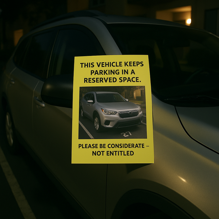 Nie zatrzymywałem jej, ale następnej nocy zrobiła to znowu i kolejnej również. Dlatego wydrukowałem kartkę ze zdjęciem jej samochodu i słowami: „Ten pojazd stale parkuje na zarezerwowanym miejscu. Proszę bądź uprzejma, nie roszczeniowa”.