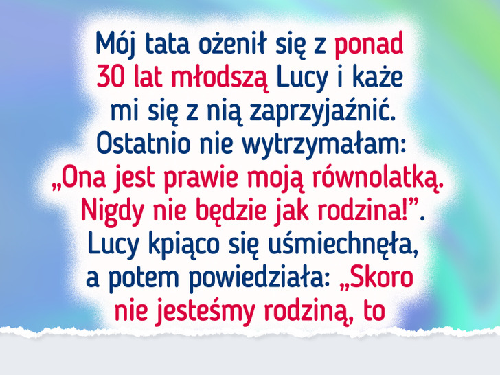 Mój 59-letni tata ożenił się z 27-letnią Lucy i wciąż zmusza mnie, żebym się z nią zaprzyjaźniła. Na samą myśl mam mdłości. Podczas niedawnej kolacji tata znowu zaczął o tym mówić. Nie wytrzymałam i wykrzyczałam: „Ona jest bliższa wiekiem do mnie niż do ciebie i nigdy nie będzie dla mnie rodziną”. Lucy tylko się szyderczo uśmiechnęła.