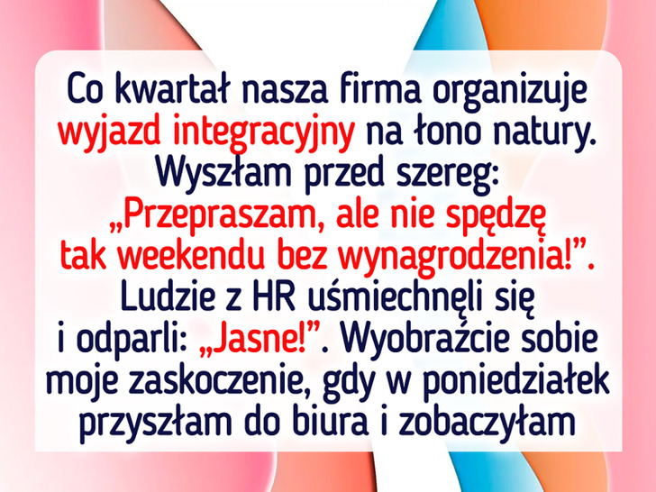 Tym razem wyszłam przed szereg i zwróciłam się do działu HR: „Przykro mi, ale nie będę spędzać weekendu z współpracownikami za darmo!”.
