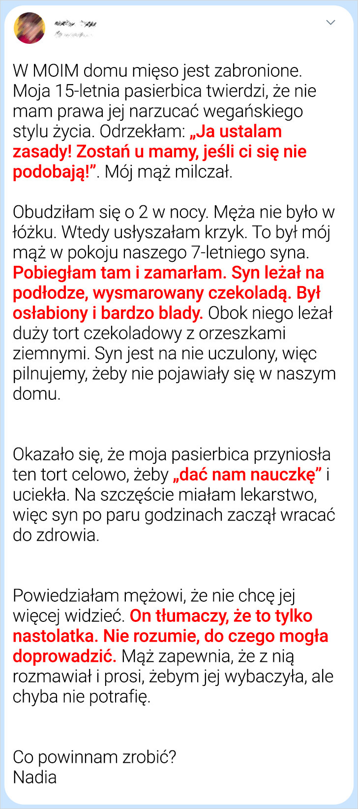 Rodziny patchworkowe często stoją przed wyjątkowymi wyzwaniami, gdzie drobne nieporozumienia mogą urosnąć do rangi poważnych problemów. Prośba Nadii o uszanowanie jej wegańskiego stylu życia w jej domu doprowadziła do niespodziewanej i intensywnej reakcji. Zaskakujące zachowanie jej pasierbicy wywołało u niej smutek złość i bezradność. Zdeterminowana, by znaleźć sposób na rozwiązanie sytuacji, zwróciła się do nas o pomoc.
