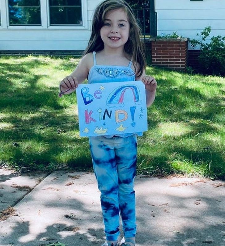 „Moja 6-letnia córka zobaczyła wiadomości i musieliśmy jej wyjaśnić, co się stało z George’em Floydem. Była przerażona. Dziś zrobiła transparent i protestuje w pokojowy sposób na naszym podwórku”.