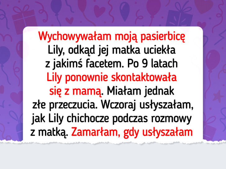 Wychowuję moją pasierbicę Lily, odkąd miała 7 lat — jej mama uciekła wtedy z jakimś facetem. Lily odnowiła kontakt z matką dopiero 9 lat później. Zawsze miałam co do tego pewne obawy, ale nigdy jej nie powstrzymywałam, bo wiedziałam, że to dla niej ważne. Niestety mój mąż (ojciec Lily) zmarł kilka lat temu.
